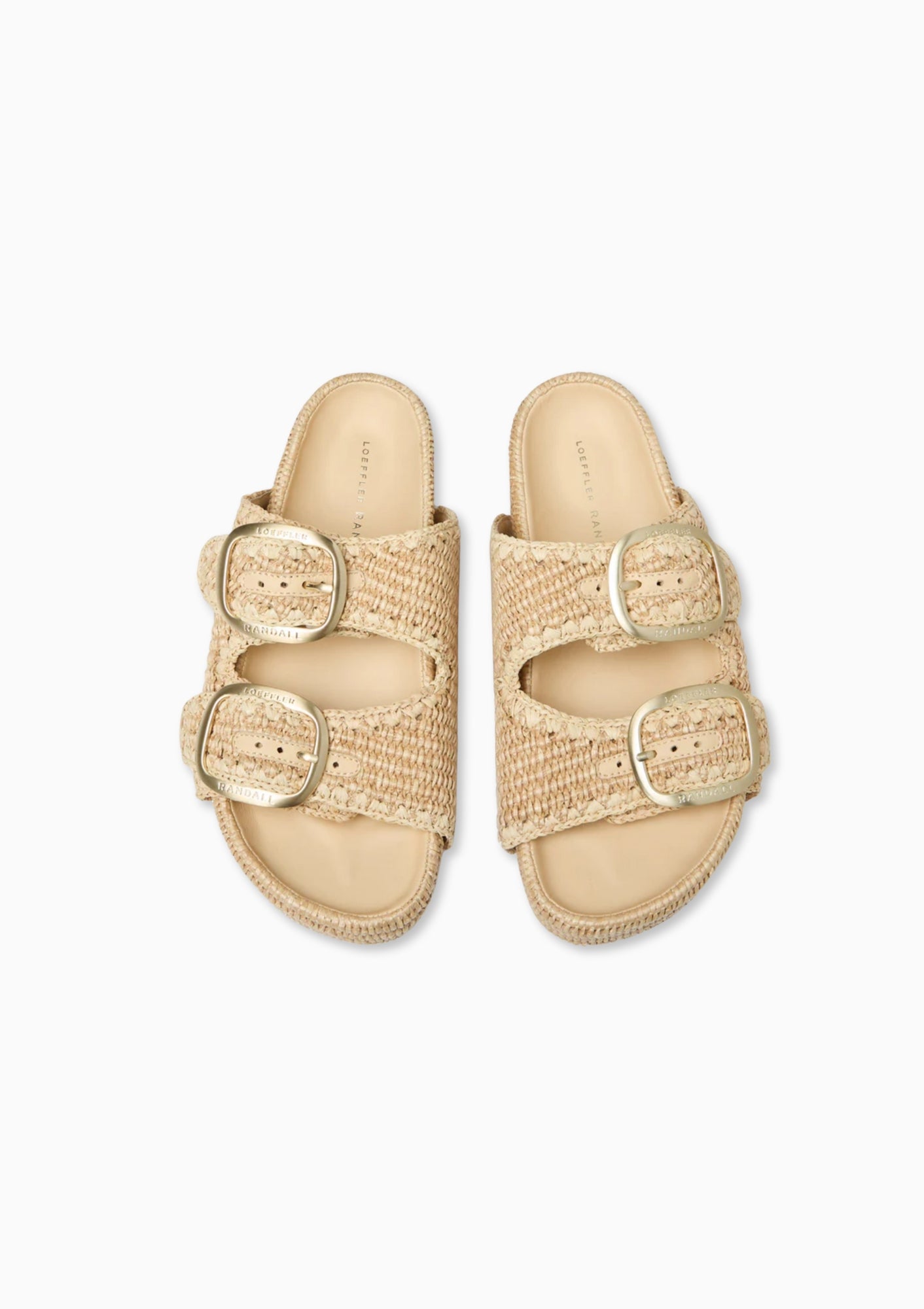 Two-band platform sandal in natural chunky woven cotton fabric with tonal whipstitch detailing. Features our signature big-buckle hardware, a padded leather footbed and an open toe. 1.5-inch platform.